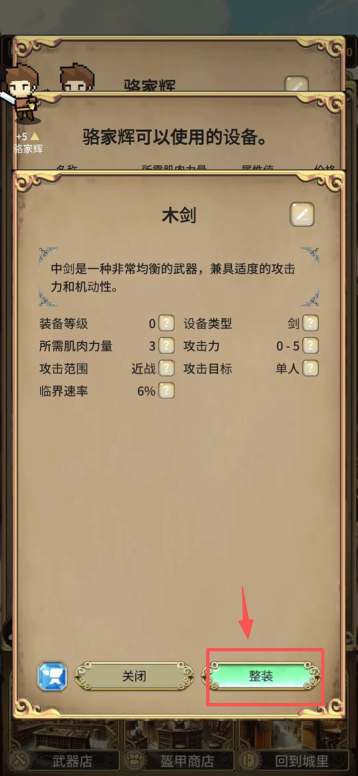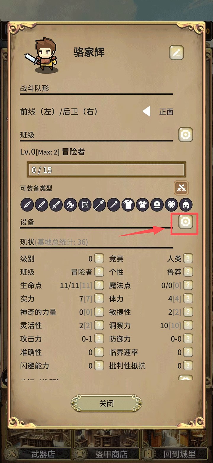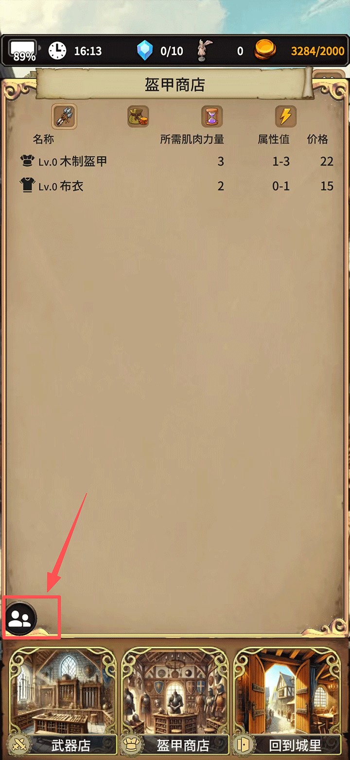 4、购买的装备可装备在冒险者身上,点击左下角的人物图标。