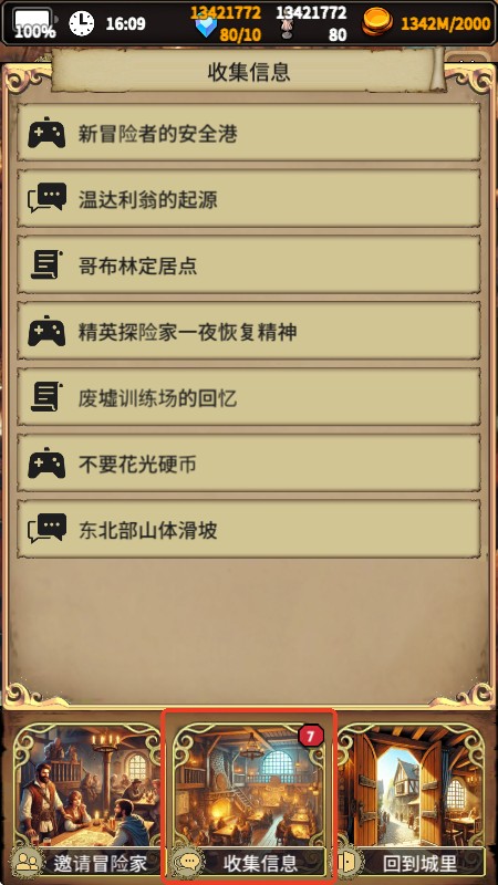 7、如果想了解新手冒险者需要知道的事项或附近树林和洞穴的小道消息,可以点击【收集信息】查看。
