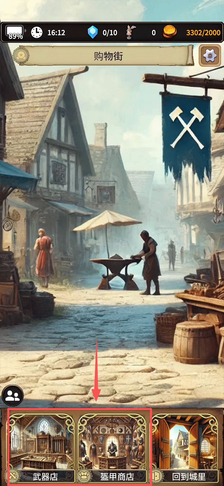 8、看完后离开酒馆,给冒险者购买一些装备,点击【购物街】进行购买。
